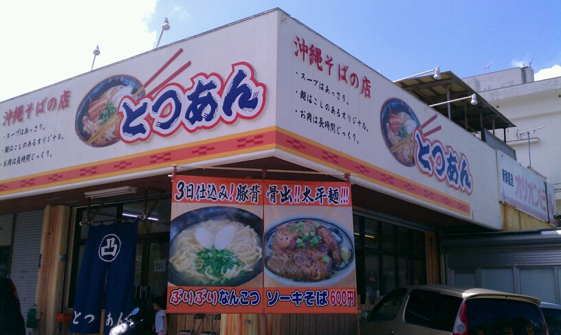 糸満市西崎2−17−1にあって、豊見城道路から南下していくと右手にサムシングフォー西崎という結婚式場があります。その交差点(ファミマが目印)を左折、すると右手にとつあんって沖縄そば屋がすぐ見えてきます。
